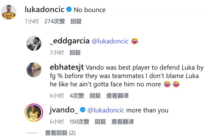03月 14 2026 0 😂东契奇和范德比尔特互动:你没弹跳 后者:比你强 xiaoqiao 2026-03-14 法甲 8 3月12日讯 今天,湖人球员范德比尔特在INS晒出了近期的照片。队友东契奇评论道:“你没弹跳。”范德比尔特回复道:“比你强。”海斯的评论如下:
